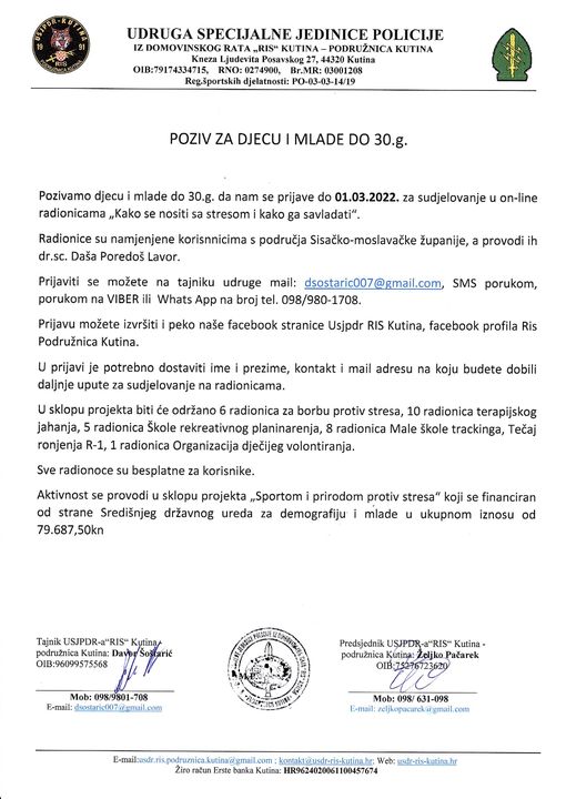 Pozivamo sve da prijavite djecu i mlade na radinicu Kako se nositi sa stresom i kako ga savladati. Radionice su on-line u trajanju og cca 90min, besplatne su za sve korisnike. Više u objavi… Zahvaljujemo se SIMORA-i na pomoći pri izradi projekta.