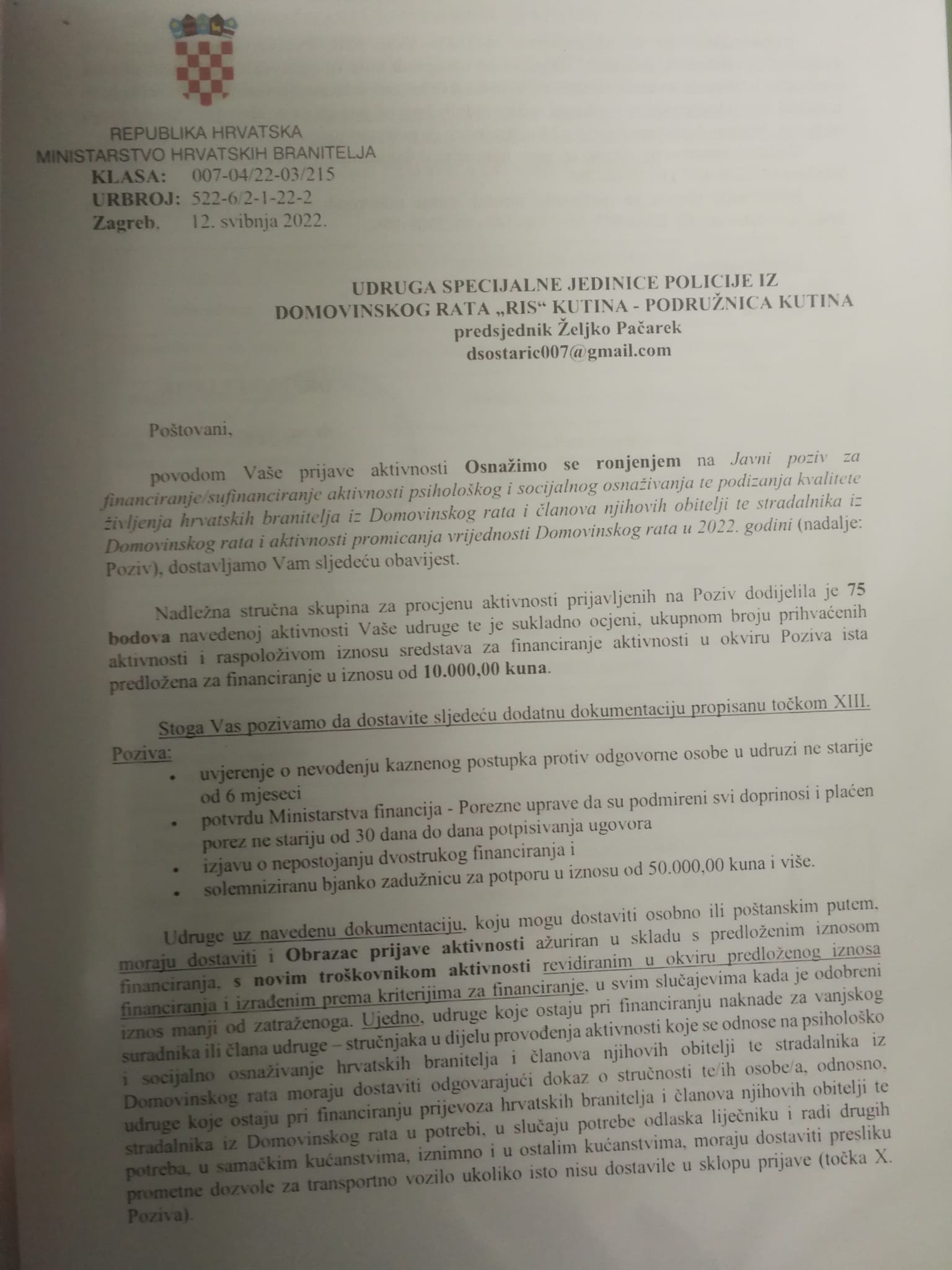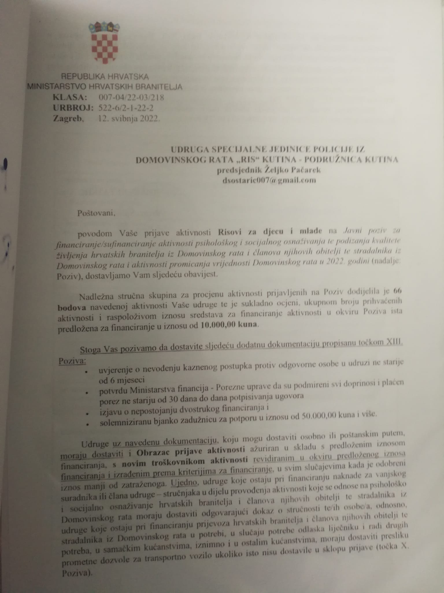 Potpisana dva ugovora sa Ministarstvom hrvatskih branitelja “Risovi za djecu i mlade”, “Osnažimo se ronjenjem”. Vrijednost svakog ugovora je 10.000kn.